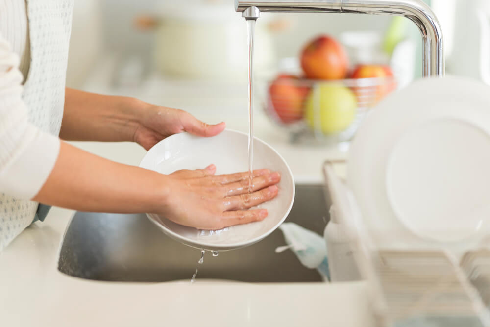バケツ等を複数個用意し、流水ではなく溜めた水ですすぐようにします。